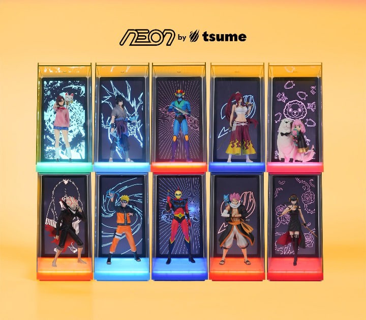 La collezione Neon by Tsume è stata realizzata come per l’allestimento di un piccolo palcoscenico, caratterizzato da uno sfondo grafico stilizzato, che contribuisce a creare un’atmosfera resa ancora più coinvolgente grazie all’illuminazione morbida e diffusa che mette in risalto i volumi. È così che la statuetta prende vita, e i suoi dettagli risaltano in modo naturale. Le teche espositive hanno tutte le stesse dimensioni: 13 x 14 x 25 cm e sono completamente impilabili. Infine, le unità possono essere collegate in serie, con un massimo di otto display Neon alimentati da una singola presa, garantendo un’installazione ordinata senza cavi ingombranti.
